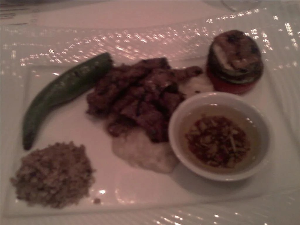 Izgara kuzu sırtı, patlıcan beğendi, naneli soğan çeşnisi ve isli firik pilavı… Yanında Büyülübağ Cabernet Sauvignon Rezerv, 2005